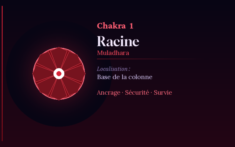 Muladhara, « ce qui soutient la racine », est le fondement de toute votre structure énergétique. Situé à la base de la colonne vertébrale, il gouverne votre rapport à la survie, à la sécurité et à l'ancrage dans le monde physique. C'est le chakra de l'instinct, de la tribu, des besoins fondamentaux -- manger, dormir, se sentir en sécurité, avoir un abri.