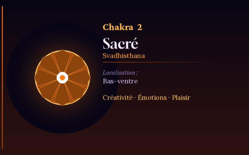 Svadhisthana -- « sa propre demeure » -- est le centre de vos émotions, de votre créativité et de votre relation au plaisir. Situé sous le nombril, il est associé à l'élément eau : fluide, adaptable, en perpétuel mouvement. C'est là que résident vos désirs profonds, votre élan créateur, votre capacité à vous connecter aux autres et à vous ouvrir à la joie.