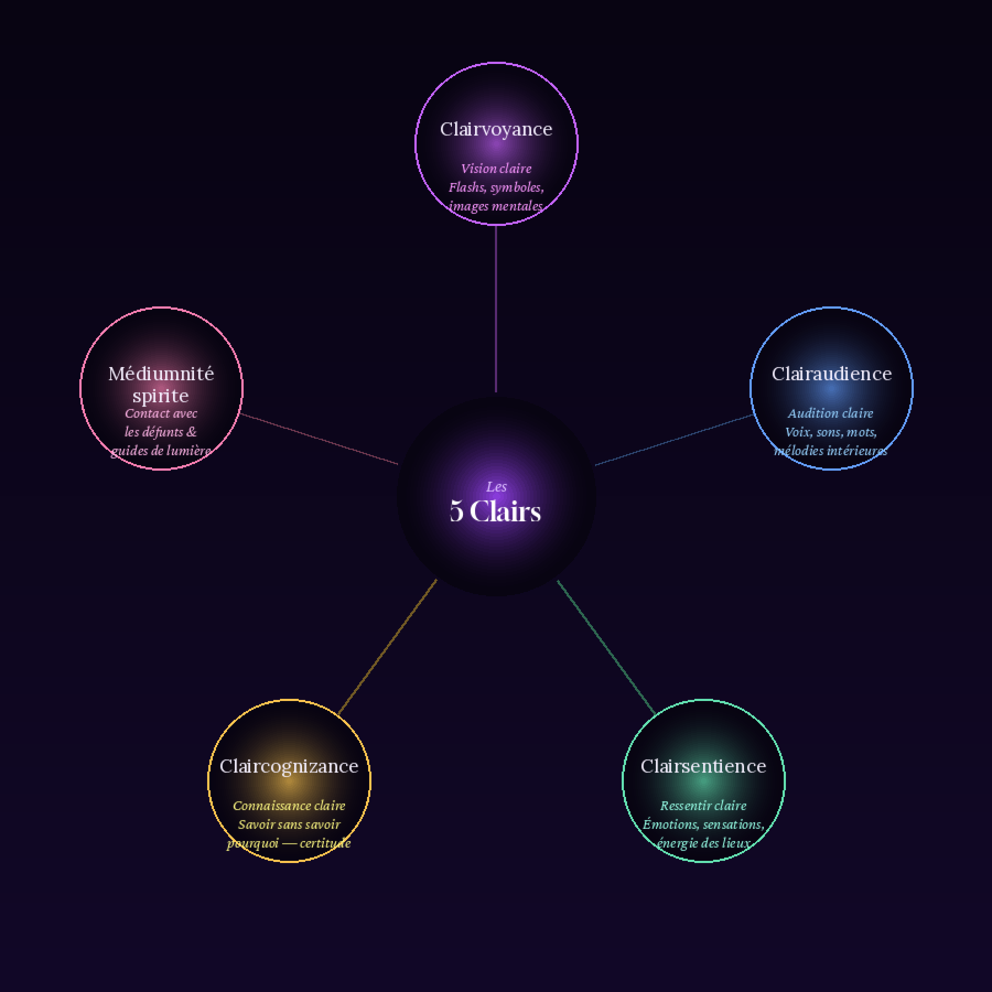 La médiumnité ne se manifeste pas de la même manière pour tous. Chaque médium a son « canal dominant » -- la modalité sensorielle subtile par laquelle les informations arrivent le plus naturellement. Ces canaux sont regroupés sous le terme de « Clairs » -- du latin « clarus », vision claire, perception lumineuse.