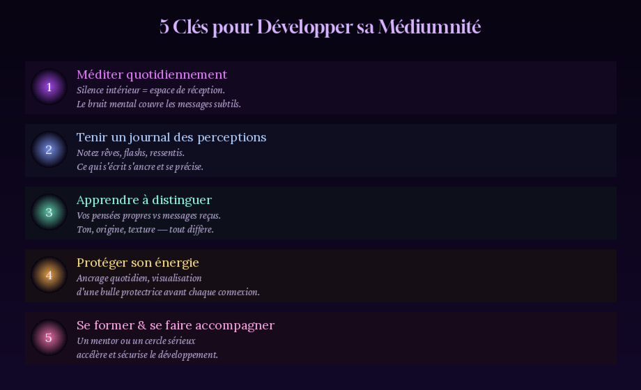 Toute perception médiumnique requiert un esprit suffisamment calme pour percevoir ce qui est subtil. Le bruit mental constant couvre les signaux fins comme une radio qui braille couvre une conversation chuchotée. La méditation quotidienne -- même cinq minutes -- est le premier et le plus fondamental des entraînements.